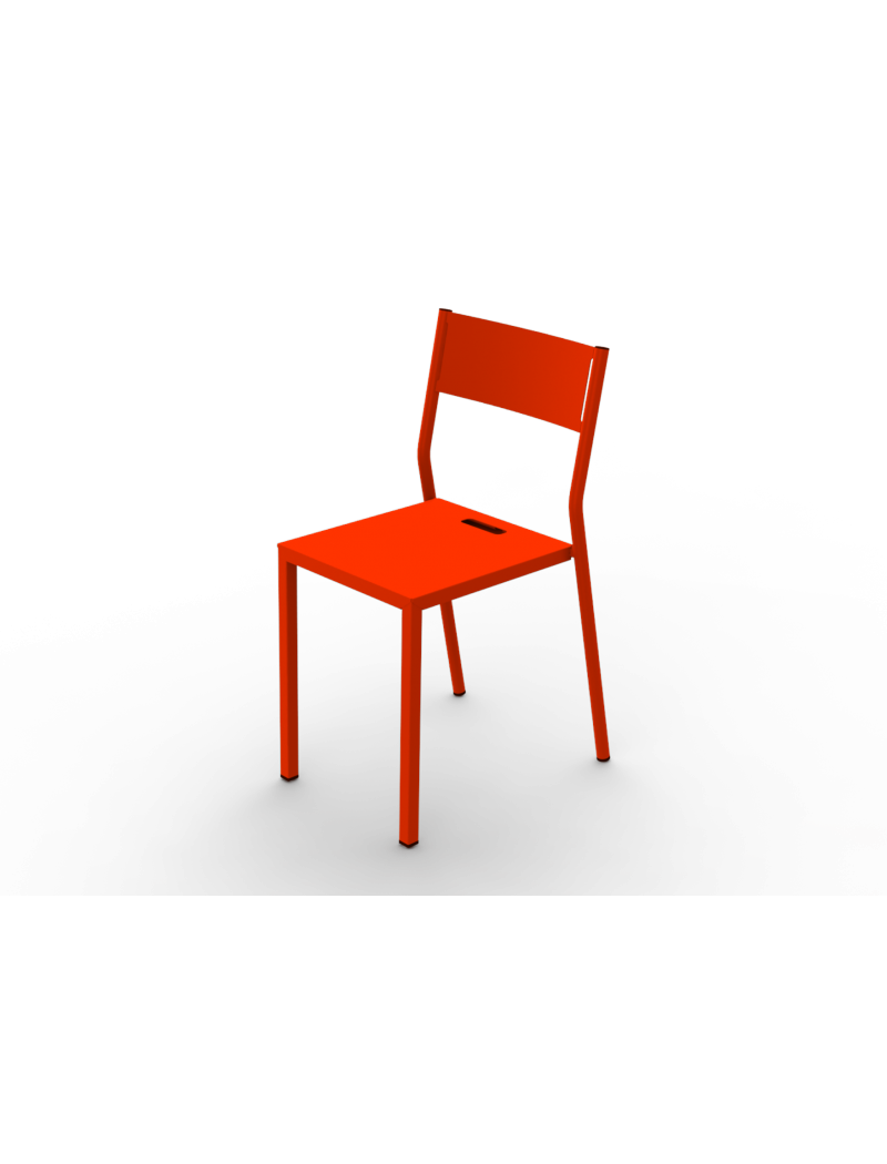 Elle est empilable et dispose d'une poignée sur l'arrière de l'assise qui facilite la préhension.