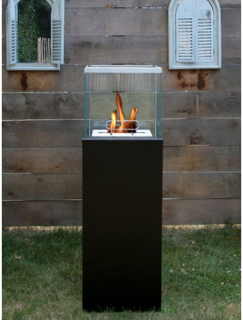 cheminée au bioéthanol Column coloris noir de Bio-Blaze ne dégage ni fumée, ni gaz. Elle possède des vitres de protection résistantes à une température de 400°C (incluses). Elle est facilement transportable grâce à ses 4 roulettes intégrées.