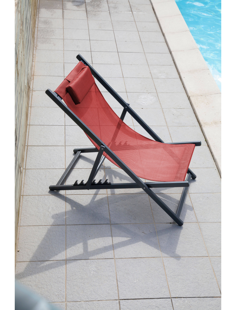 La nouvelle chilienne Linéa de Proloisirs dispose d'un chassis en aluminium epoxy coloris gris, et d'une toile TREP pour l'assise coloris rouge.