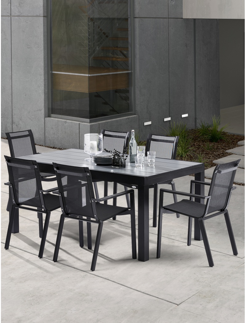 Le salon de jardin HPL Star comprend: - Une table en aluminium noir et plateau gris clair - 6 fauteuils en aluminium et assise grise... Lire la suite