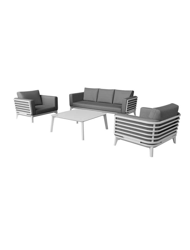 La structure des fauteuils, du canapé et de la table basse est en aluminium. Ce matériau vous offre la possibilité de faire séjourner votre salon de jardin en extérieur et même de l'utiliser en bord de mer car il ne craint pas la corrosion. La peinture époxy qui recouvre la structure lui offre une belle finition tout en le protégeant contre les UV.