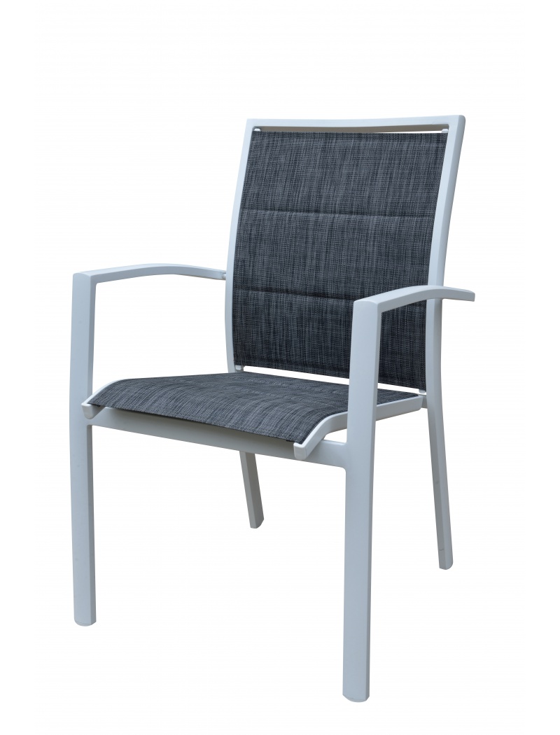 Le fauteuil Modulo a une structure en aluminium blanc et une assise en textilène de couleur gris chiné.