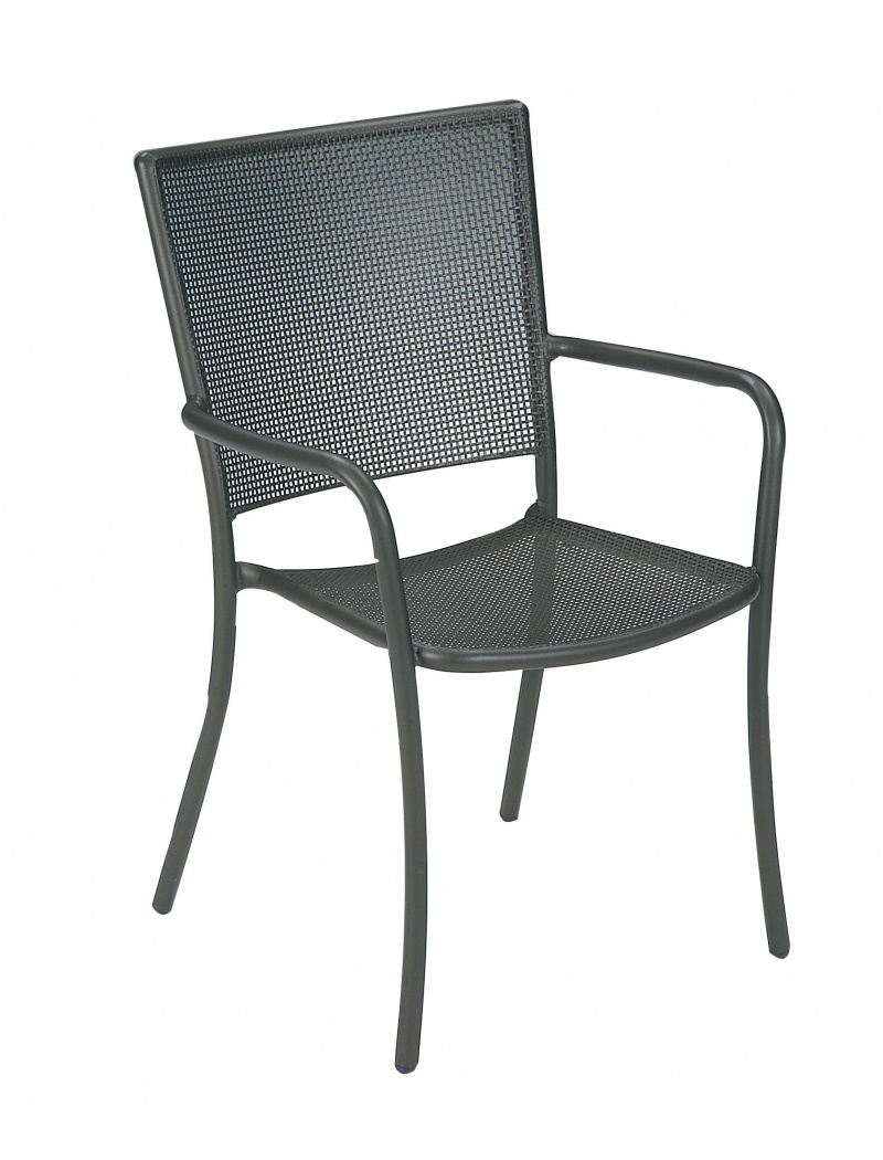 Le fauteuil Athena a une structure en acier vernis avec un motif ornemental en tôle tressée, élément qui caractérise cette collection du fabricant italien Emu.