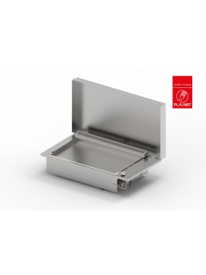La plancha OASI 80 encastrable de la marque Pla.net dispose d'une structure intégralement en inox et de deux zones de cuisson réglables indépendamment, l'une en inox lisse et l'autre en inox lisse rainurée, et sur lesquelles il est possible de cuisiner pour 10 à 12 personnes.