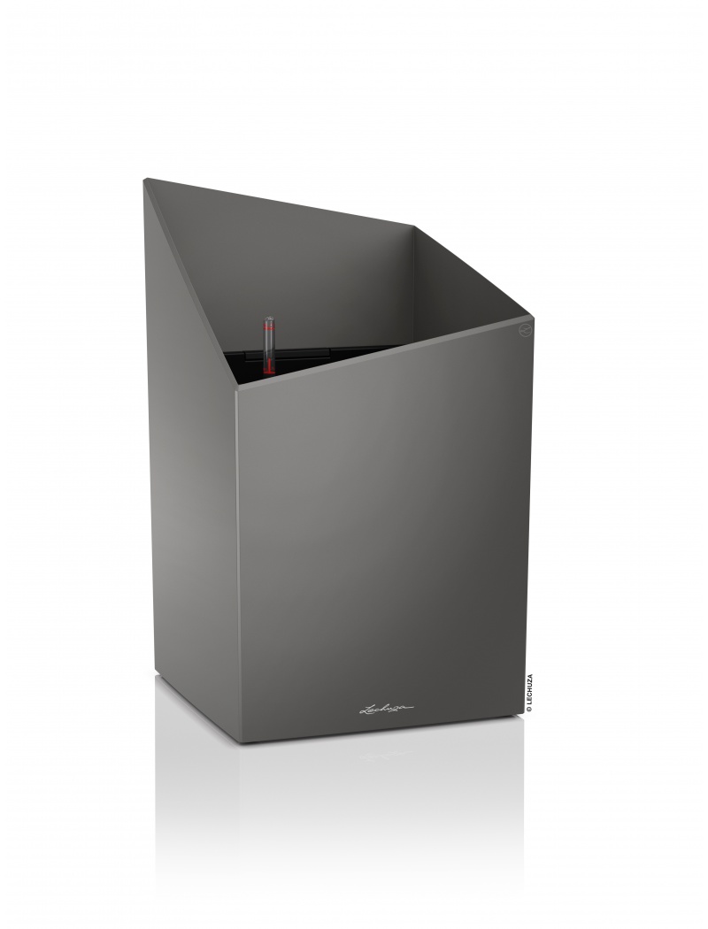 Le bac CURSIVO Premium de Lechuza dispose du système d'arrosage breveté Lechuza. Ce système amovible est intégré dans un contenant aux formes modernes et anguleuses et à la finition métallisée anthracite du plus bel effet