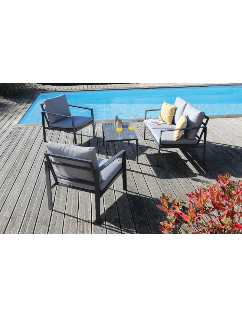 L'ensemble est en aluminium finition epoxy graphite et dispose de coussins déhoussables.