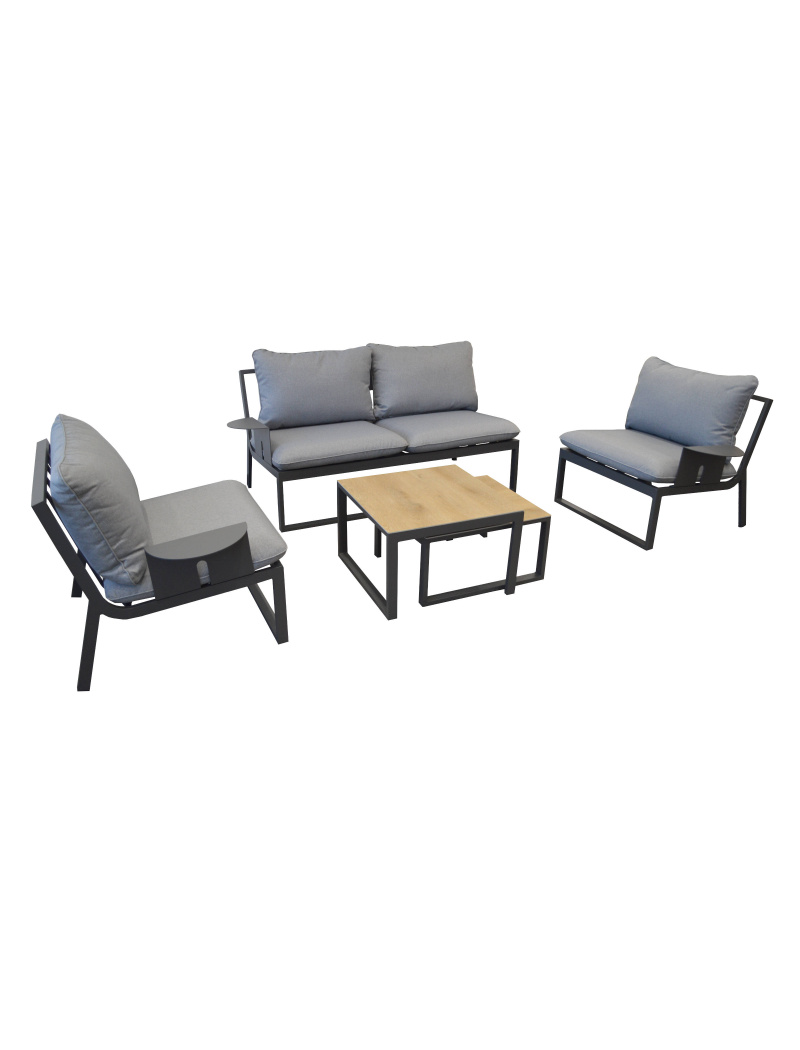 Composé de 2 fauteuils et d'un canapé 2 places à l'assise mi-ferme, chaque élément comprend des tablettes/accoudoirs pour plus de convivialité. Pour compléter l'ensemble, des tables basses Gigogne vous permettront d'agencer votre extérieur comme vous le souhaitez.