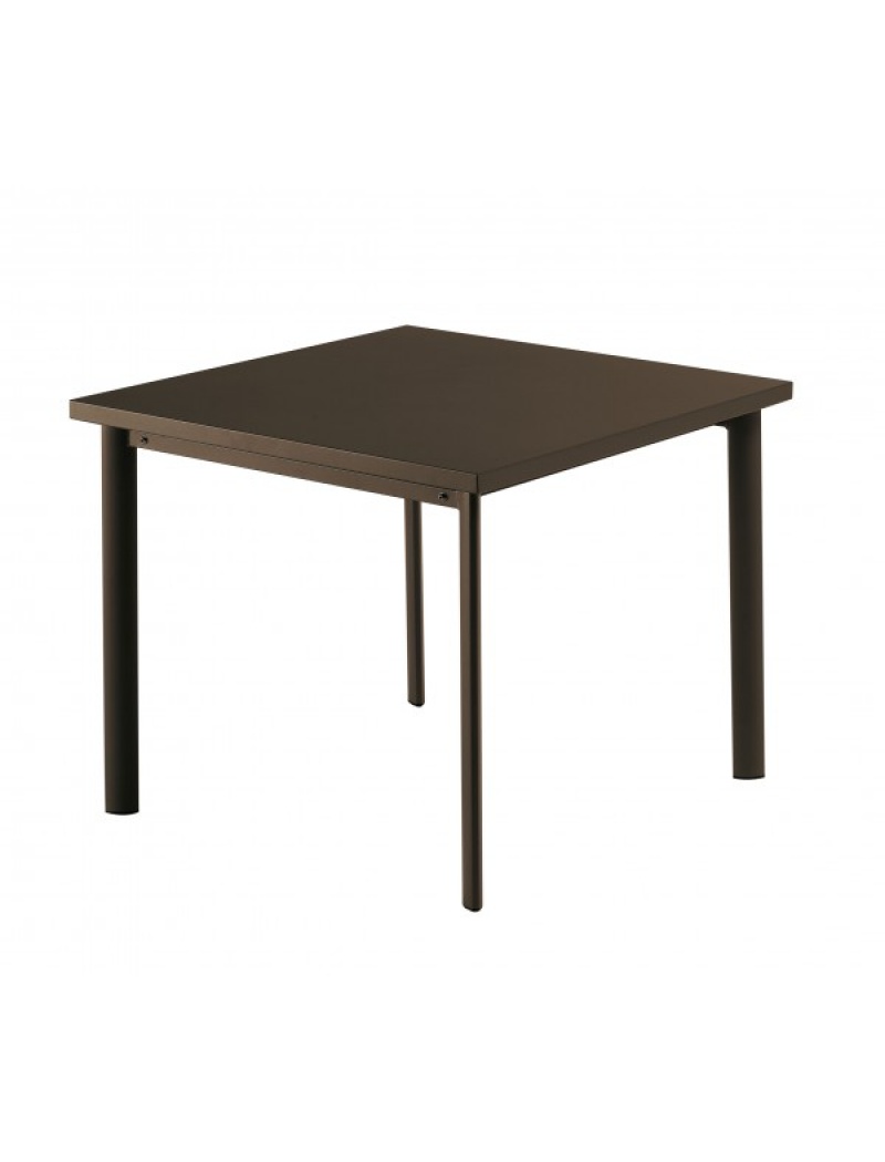 Cette table carrée possède un dessus en tôle galvanisée à chaud renforcé par une structure métallique supplémentaire sous le bord. Les pieds en tubulaire métallique sont reliés à des traverses en tubulaire de section rectangulaire et fixés au plan par des visseries en acier inox.