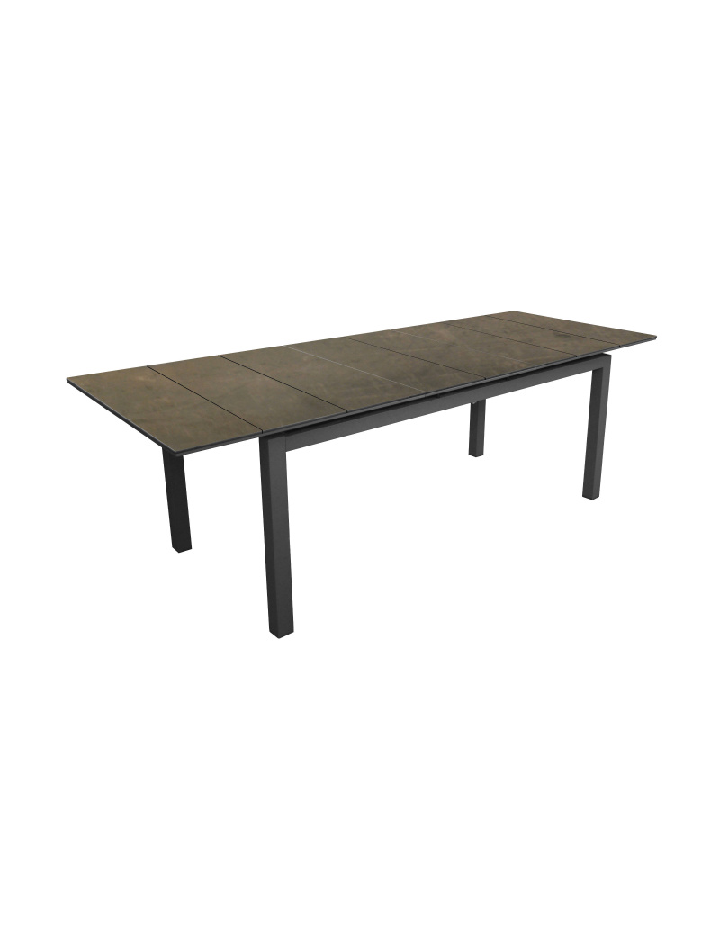 Equipée d’un élégant plateau à lames Fundermax®, cette table d'extérieur est résistante aux rayures, à la chaleur et aux UV.